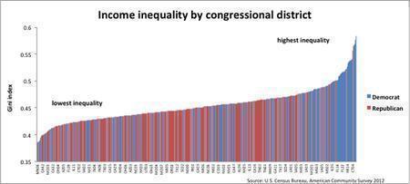 The Atlantic • April 7 2014 The Polarized Partisan Geography of Inequality Democrats represent some of the richest House districts—but they're also more likely to have deeply unequal constituencies. Is that why the party is more focused on income disparities?